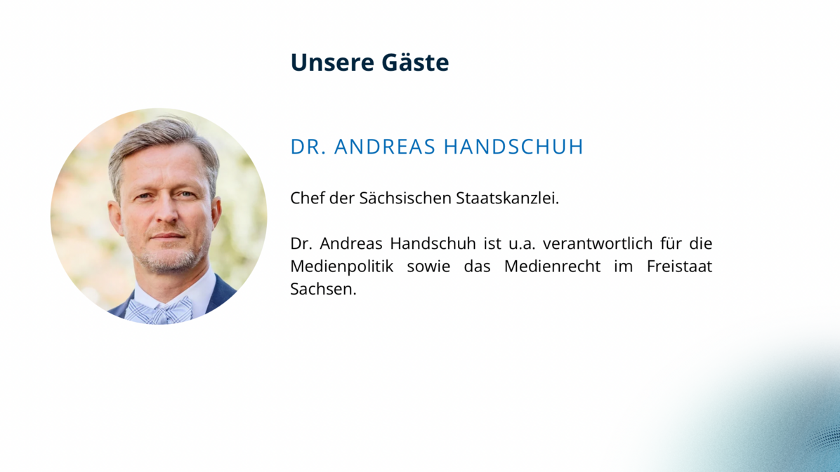Wir freuen uns auf den Chef der Sächsischen Staatskanzlei, Dr. Andreas Handschuh, sowie zahlreiche interessierte Gäste aus der Medienbranche.